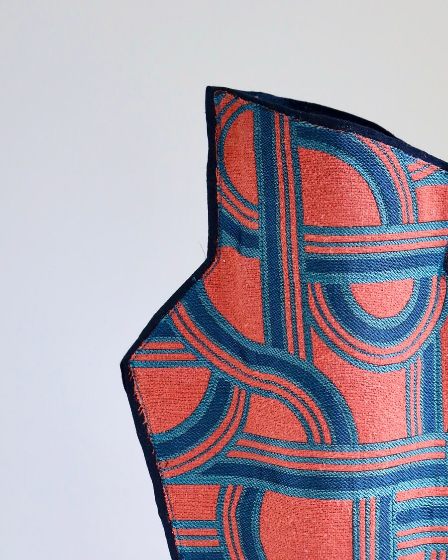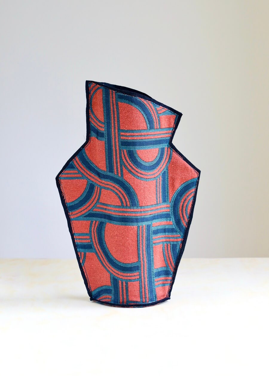 Ce vase textile esprit 60’s est confectionné avec un tissu d’ameublement de chez Dédar motifs entrelacs.