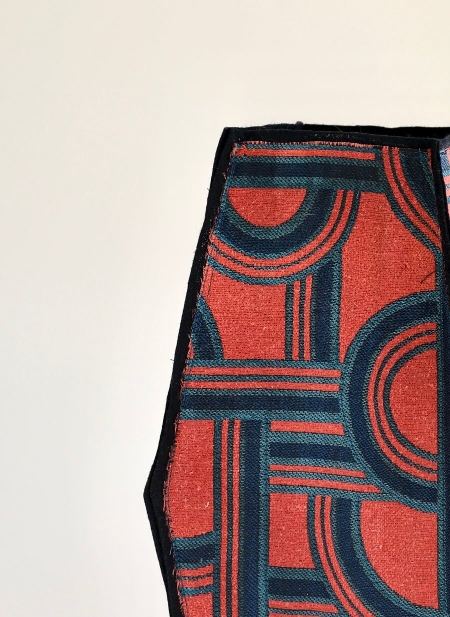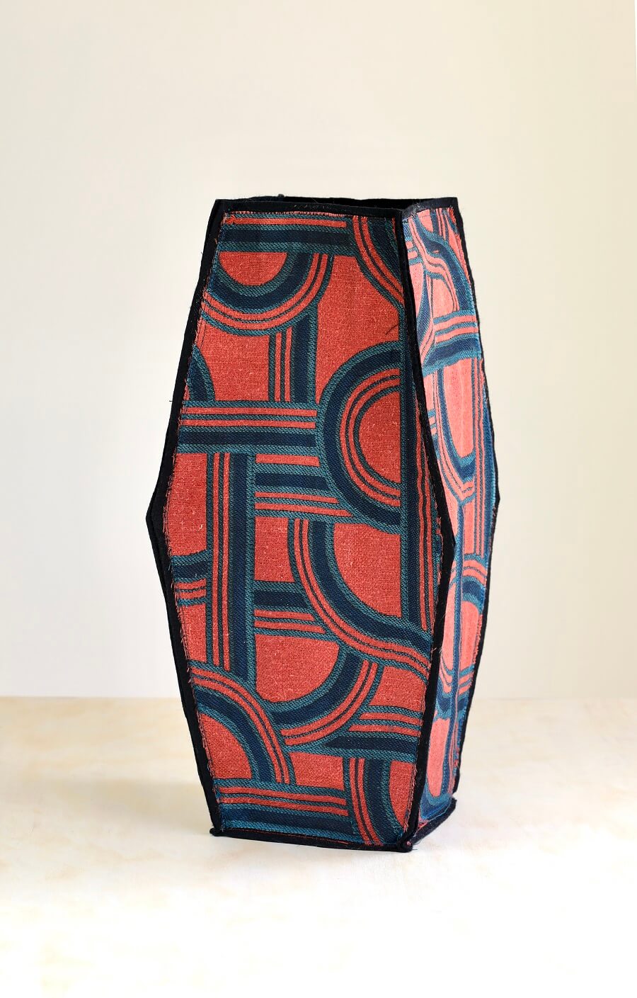 Ce vase textile à quatre faces est confectionné avec un tissu Dédar motifs entrelacs.