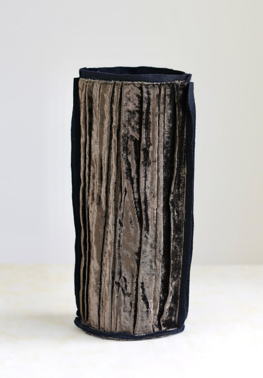 Ce vase textile forme tube est confectionné avec un très velours d’ameublement plissé coloris chocolat .